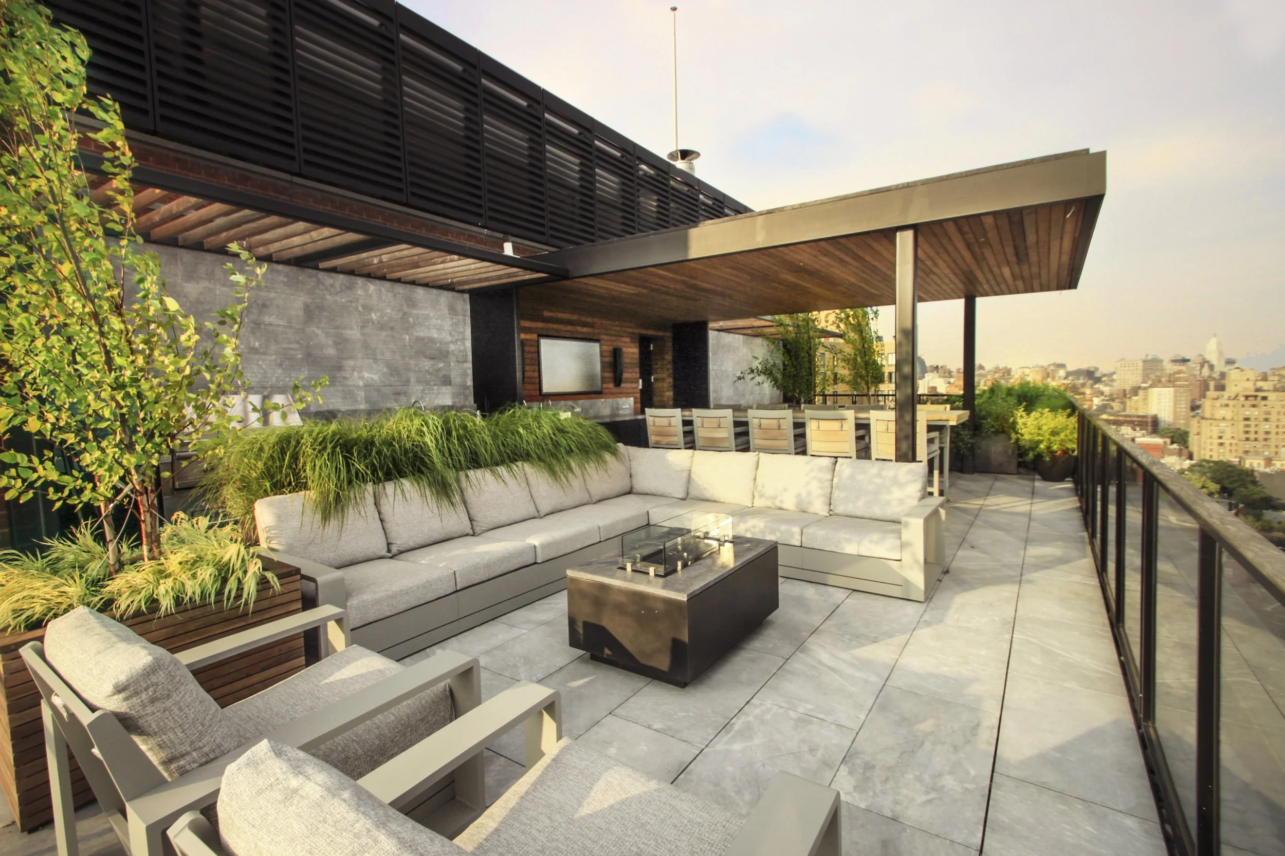 The rooftop includes cantilevered arbors that cast shadow patterns across raked marble
