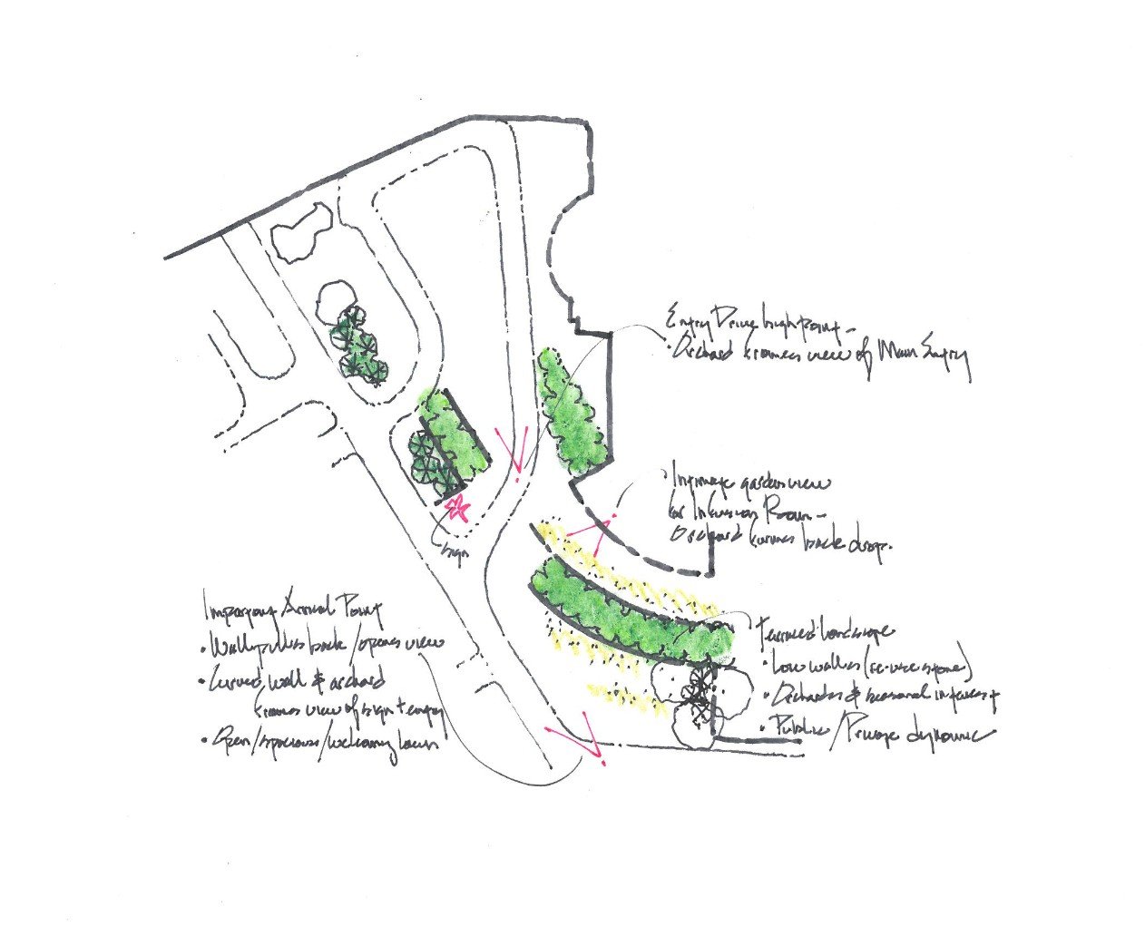 primary and secondary circulation routes. A formal tree allée announces the entrance